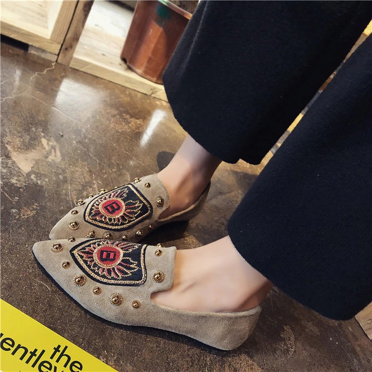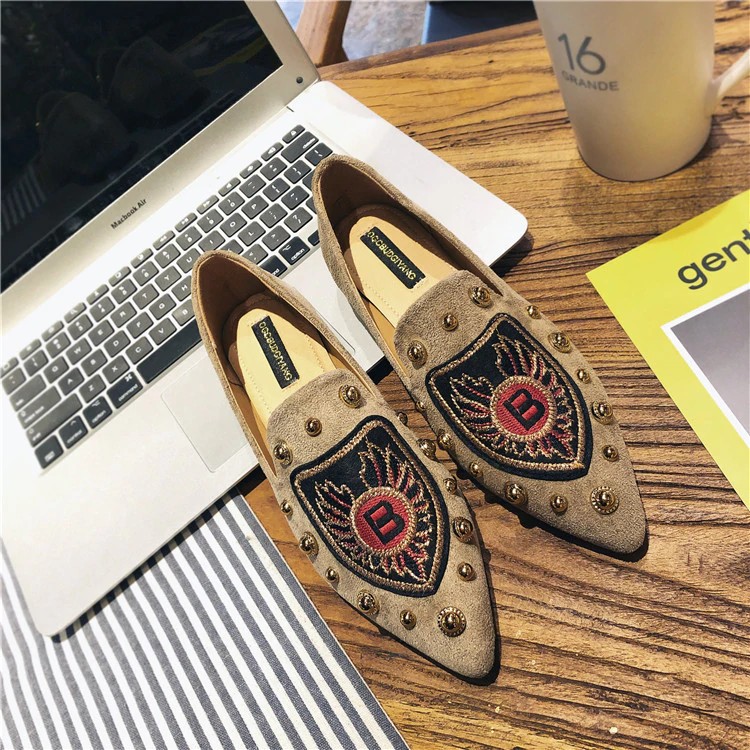 Put on these suede ballet flats with a crest print on the front.