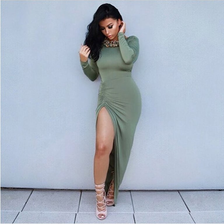 Women's long dress with long sleeves and a round neckline. The dress features a large back cut-out, is fitted to the body, and has a high slit.