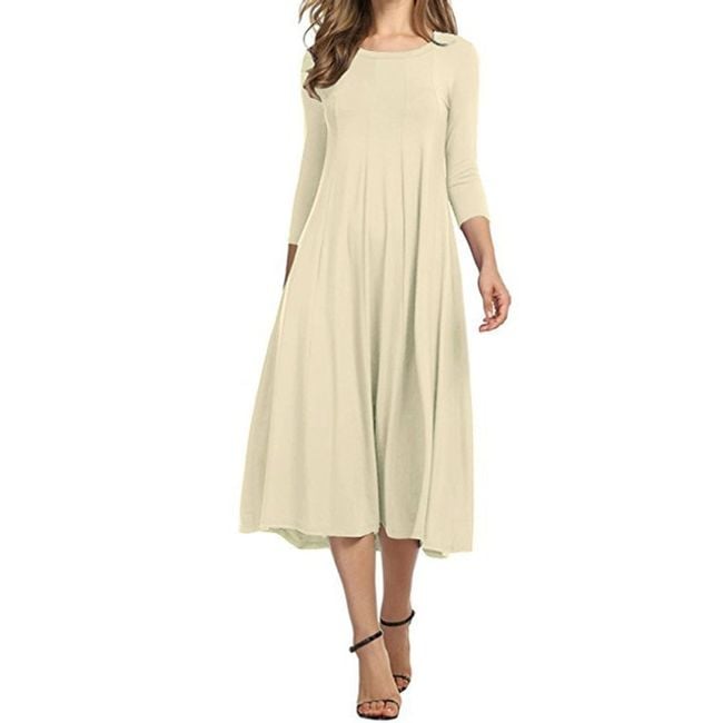 The dress has three-quarter sleeves and can be complemented with a belt.