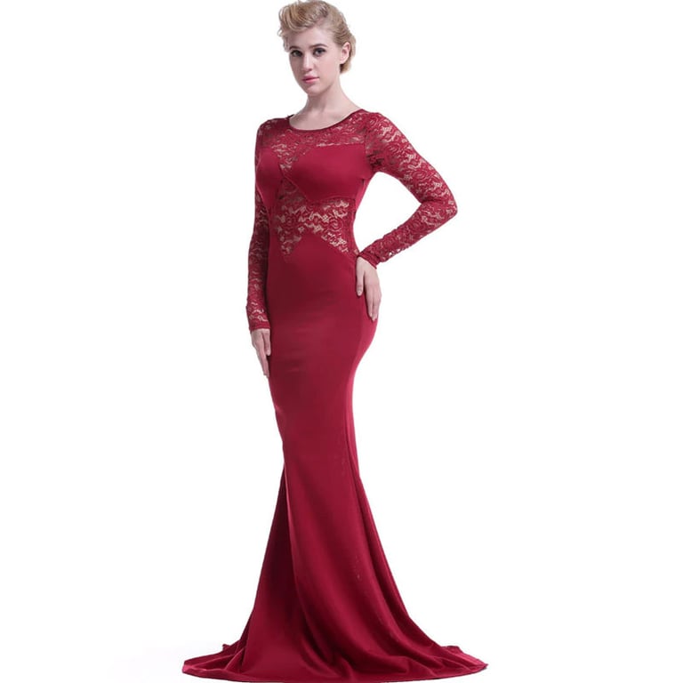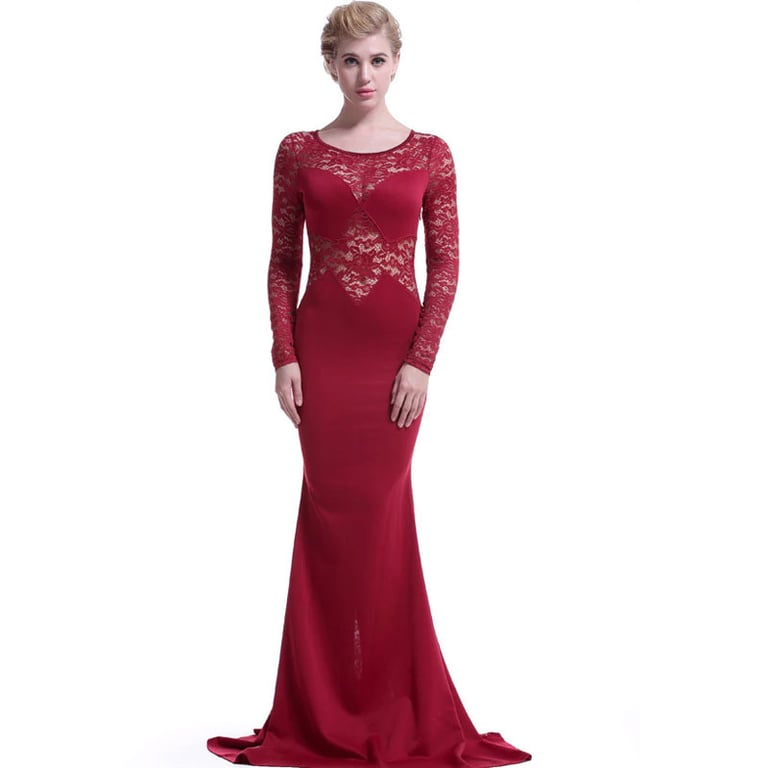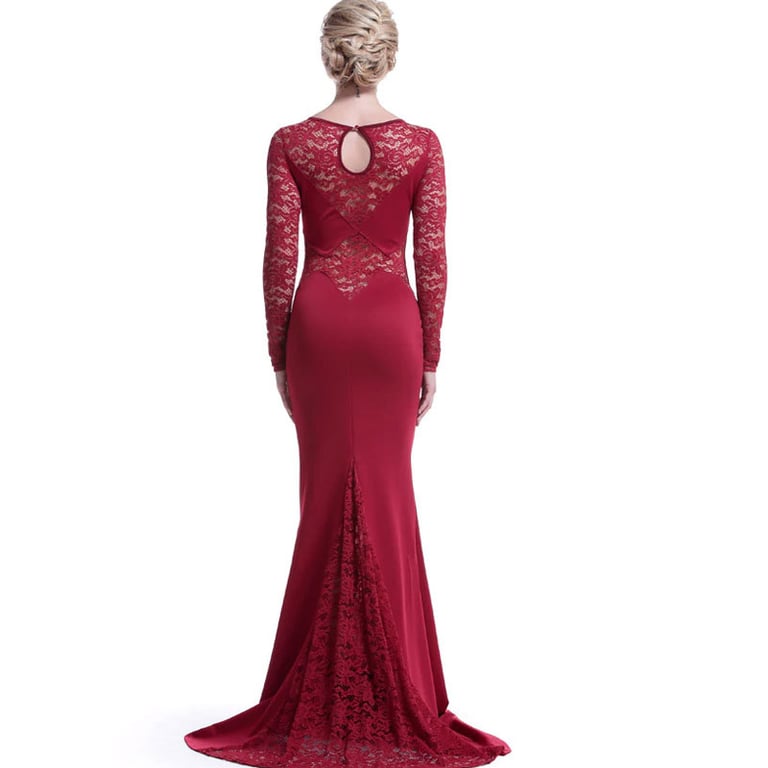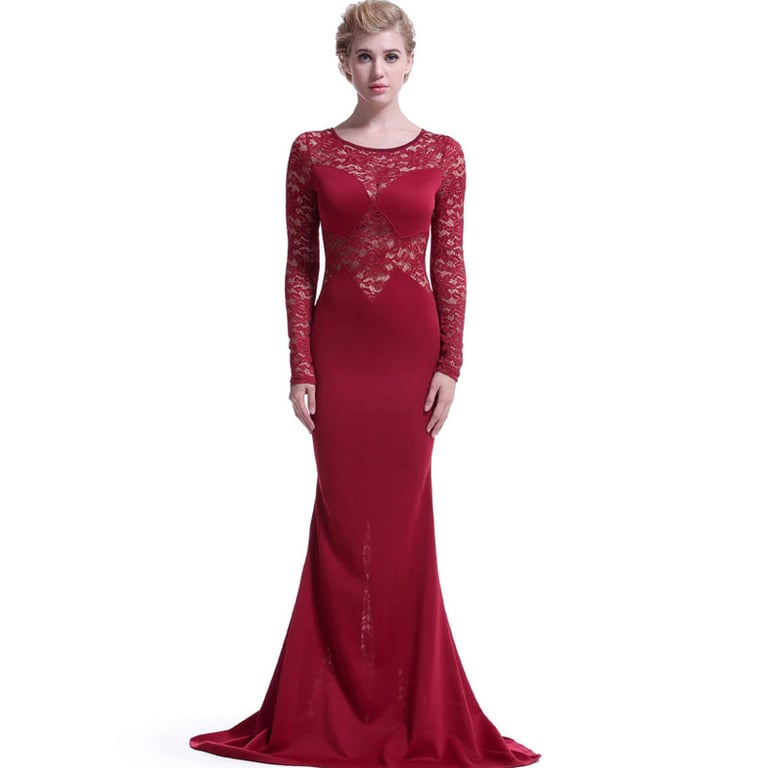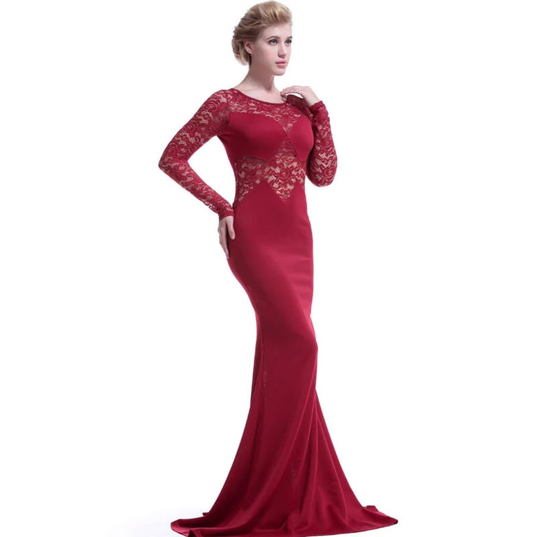 Women's long evening dress with long sleeves. The dress hugs the body and has a floor-length skirt. The neckline and sleeves are adorned with lace. Available in three colours – black, red, and blue.