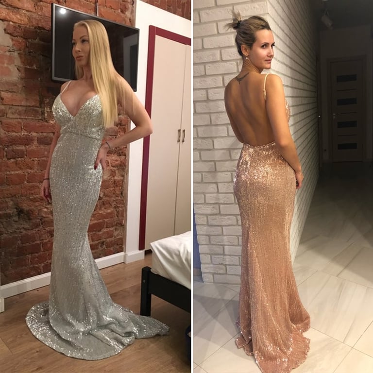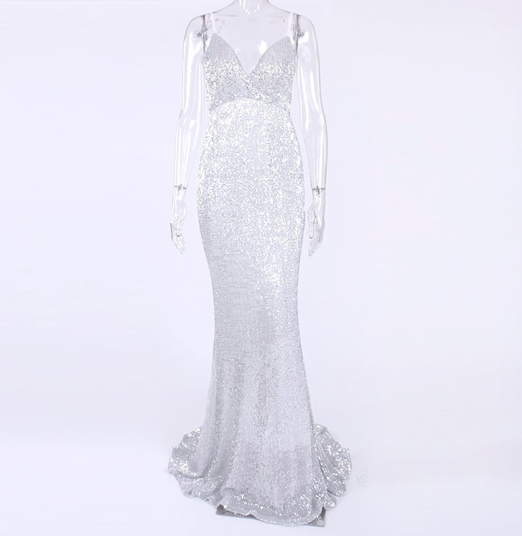 Long evening sequin dress with an open back.