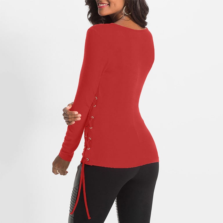 Women's long-sleeve t-shirt. The top features a deep crossover V-neck and lacing on the side. Available in two colours – black and red.