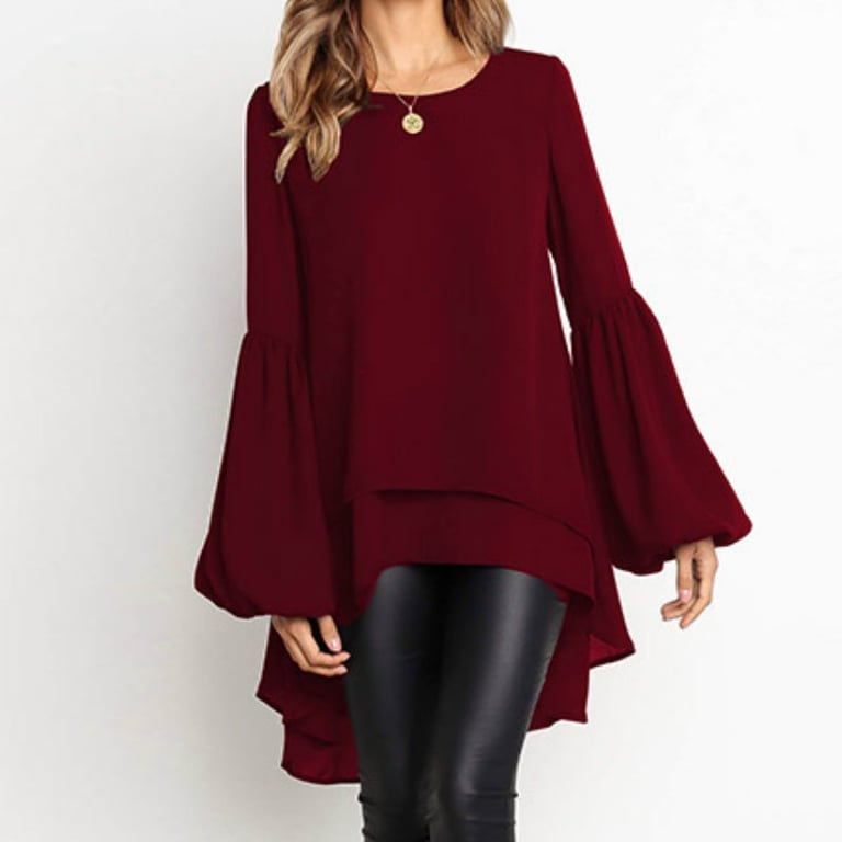 Women's long top/t-shirt with an asymmetrical loose fit. The t-shirt features long flared sleeves and a round neckline. Available in solid colours. Available in several variants.