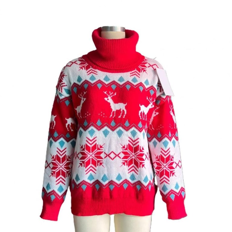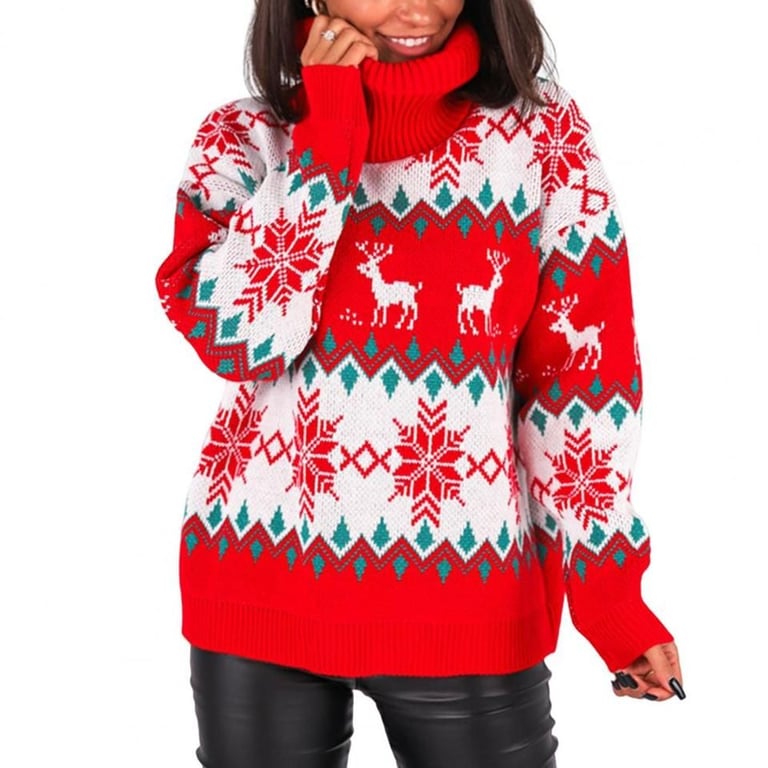 Stylish women's knitted sweater with a hint of Christmas atmosphere. The sweater features a high turtleneck, making it suitable for colder weather.