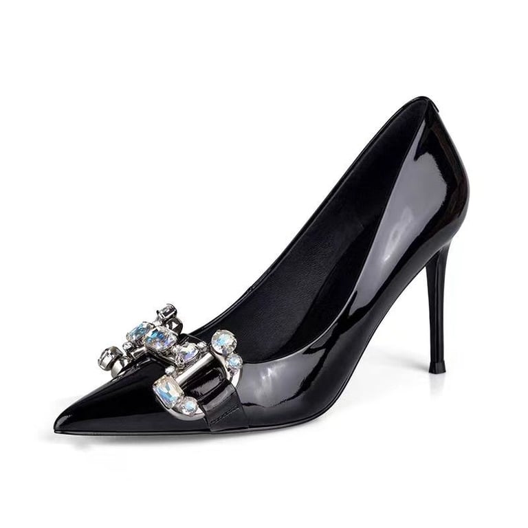 Elegant high heels adorned with a buckle featuring rhinestones.