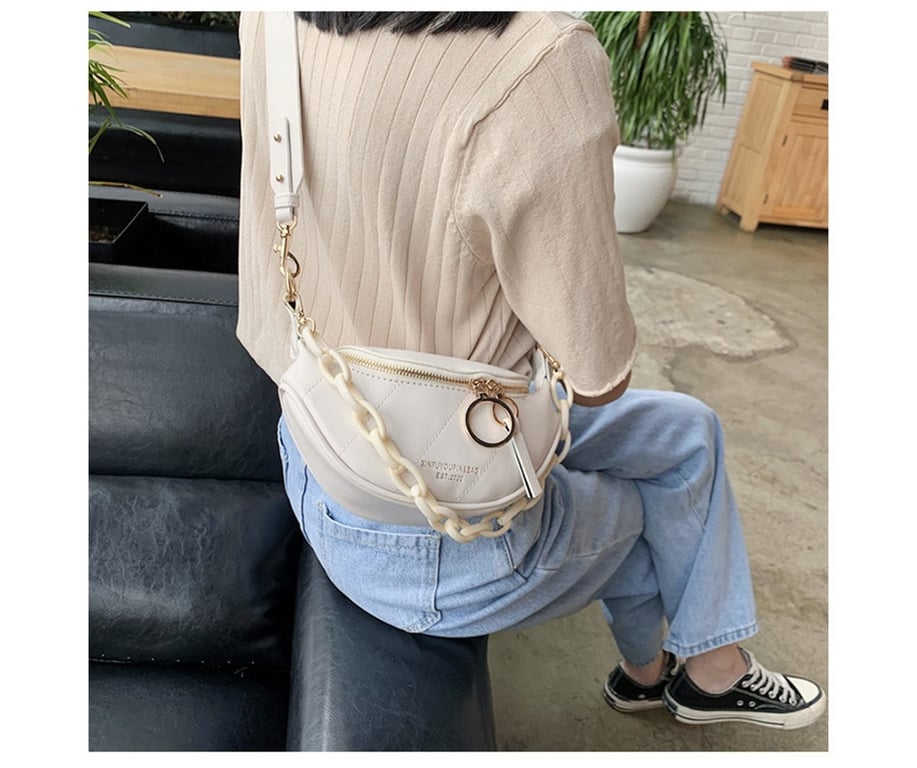 • The standout feature of this bag is the chunky chain that decorates it, and it's up to you how to wear it as a fanny pack.