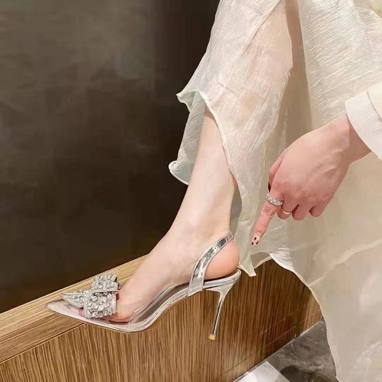 Women's glossy transparent shoes with a narrow heel.
