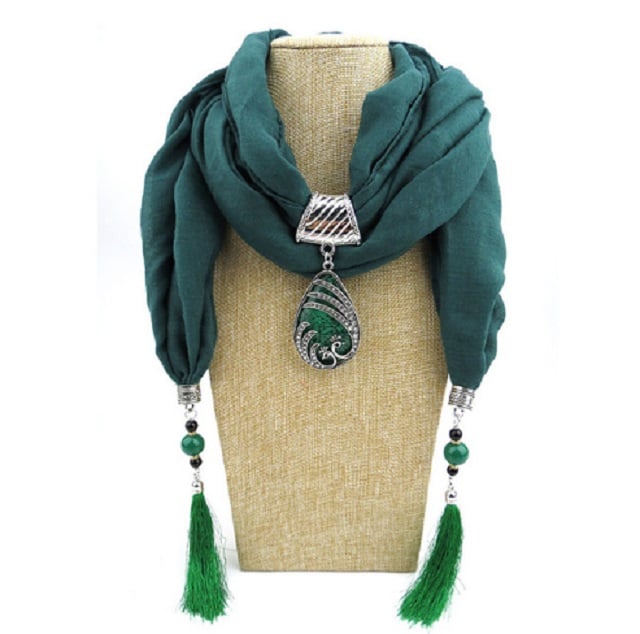 This luxurious scarf with a water droplet pendant and fringes will be an adornment to your outfit.