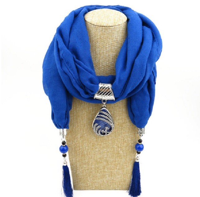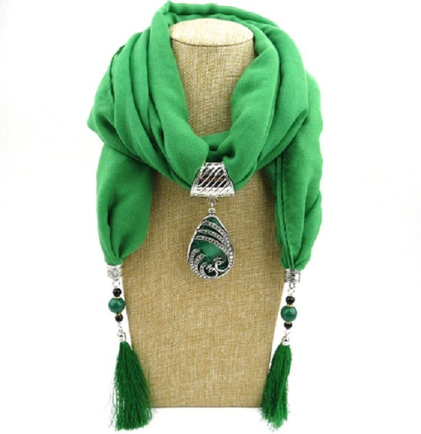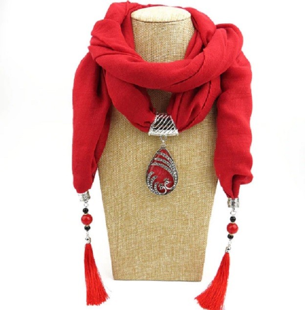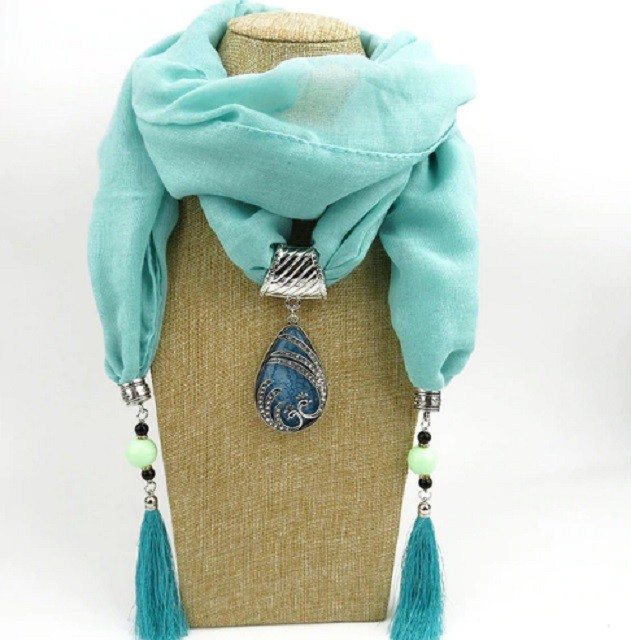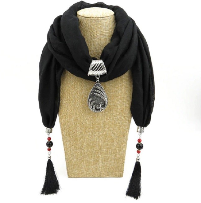 This luxurious scarf with a water droplet pendant and fringes will be an adornment to your outfit.