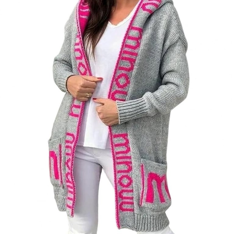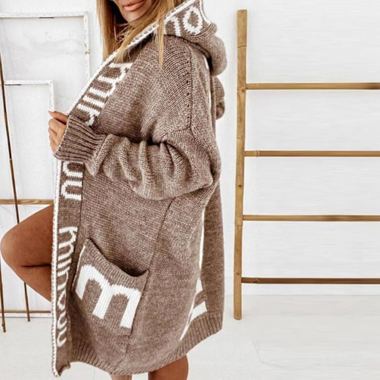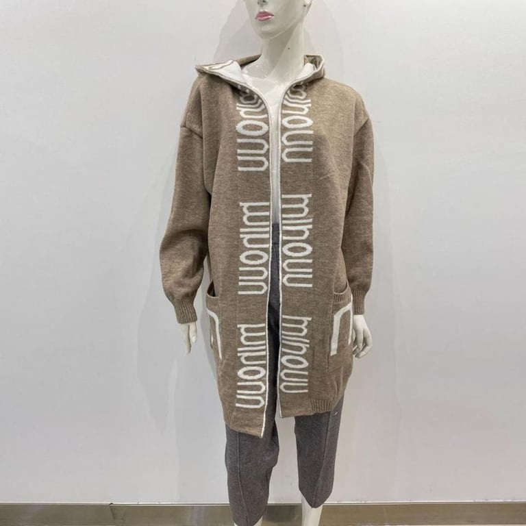 Stylish long women's sweater coat with a hood. The coat is insulated, making it suitable for cold weather.