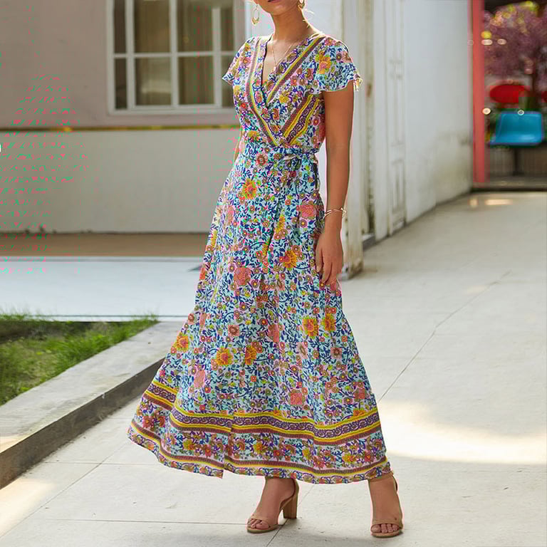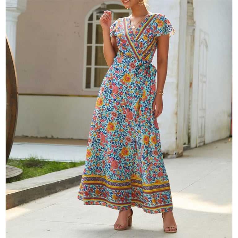 Women's long dress with short sleeves. Loose wrap style with a tie belt at the waist. Printed with a colourful pattern. Available in multiple colour variants.