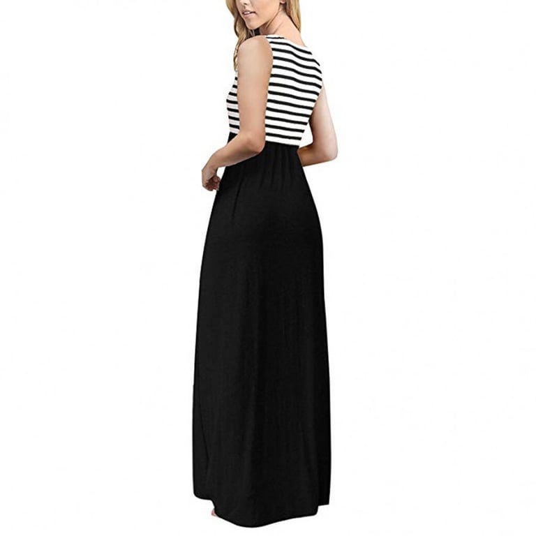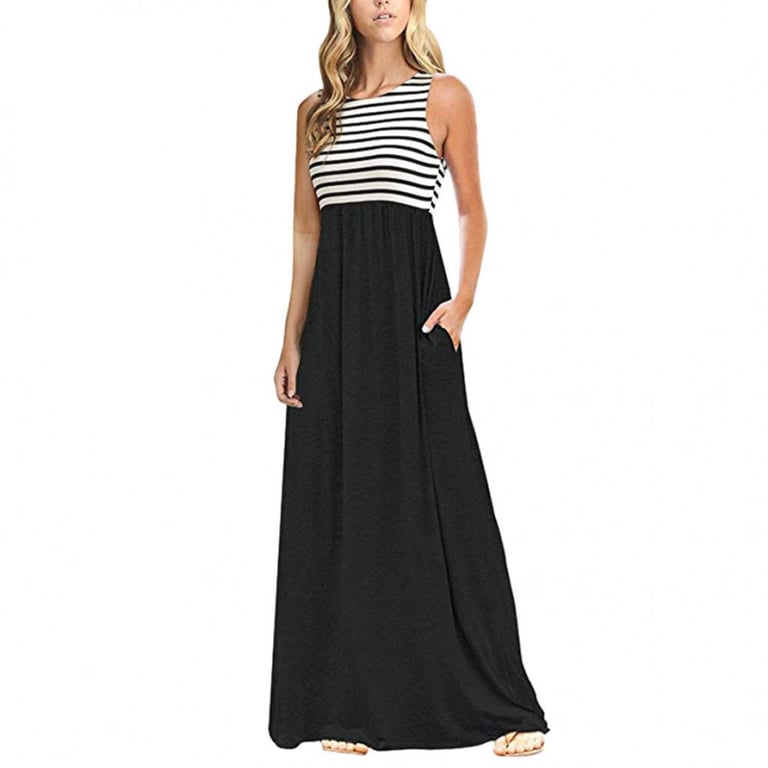 Women's dress with a long wide skirt. The top features wide straps, a round neckline, and a striped pattern. Available in multiple colour options.