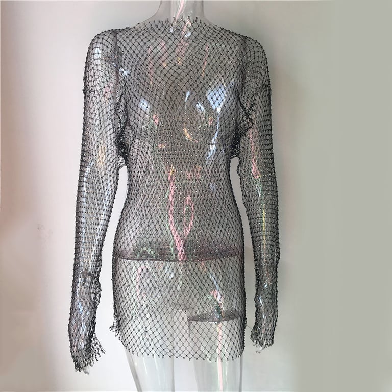 Women's mini dress with long sleeves made of mesh material.