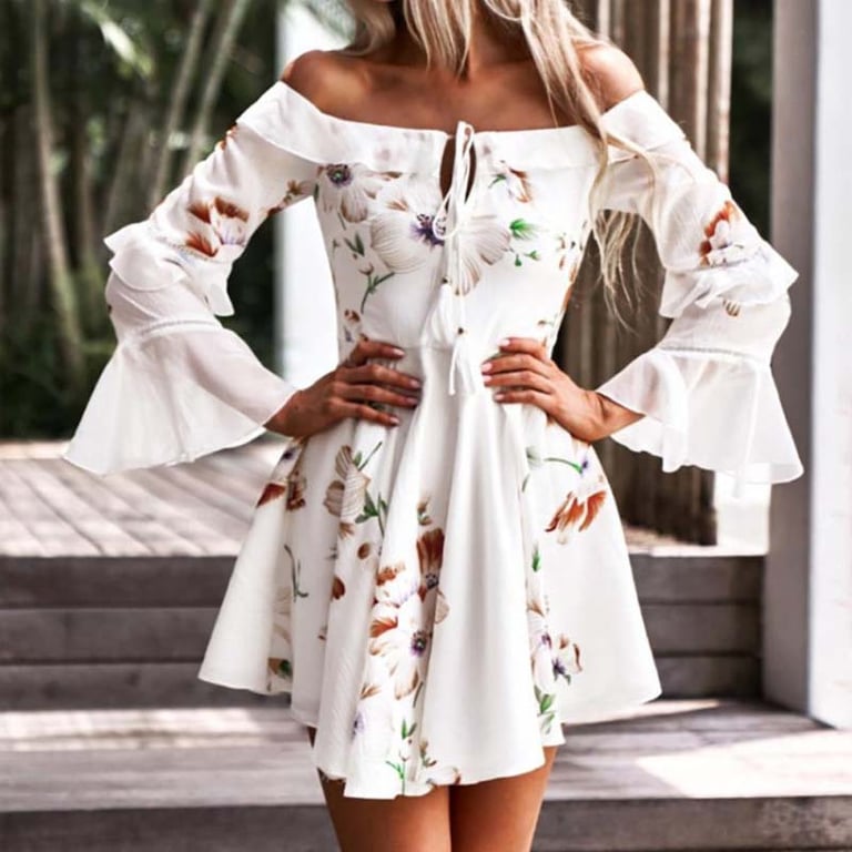Stylish ladies' dress that will make you look truly irresistible in any situation! This is a mini dress model with off-the-shoulder sleeves. Shipping is free with us.