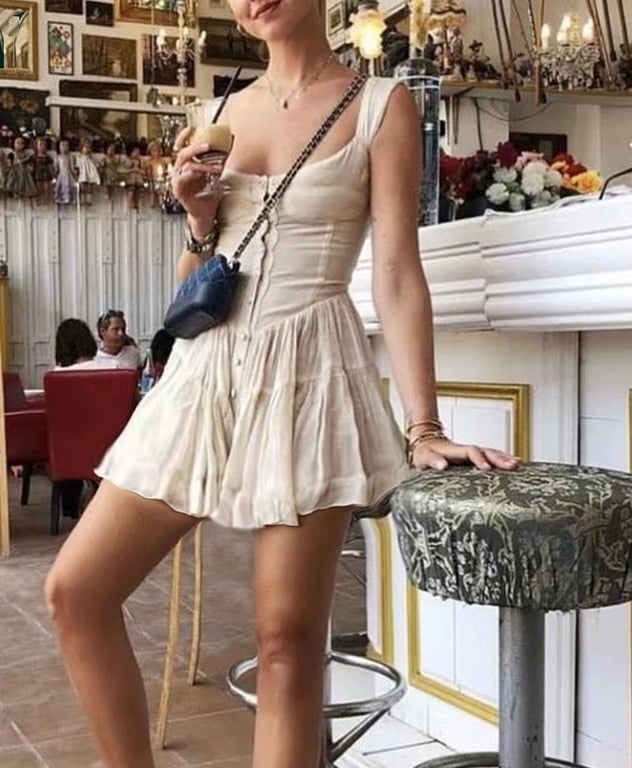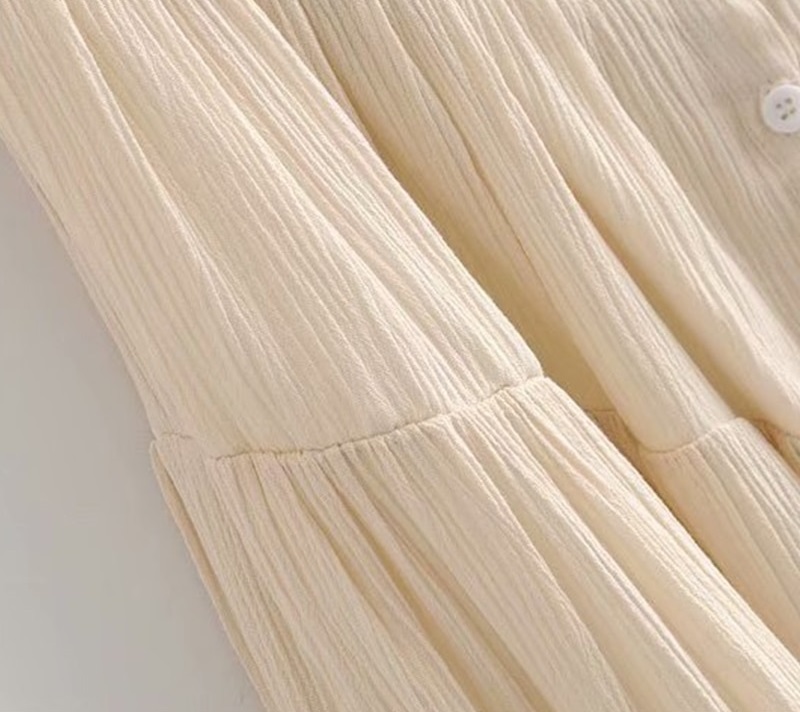 Lightweight mini dress with straps. Decorated with buttons and a frill.