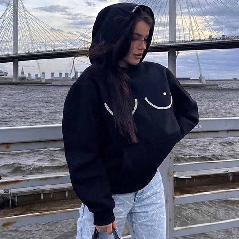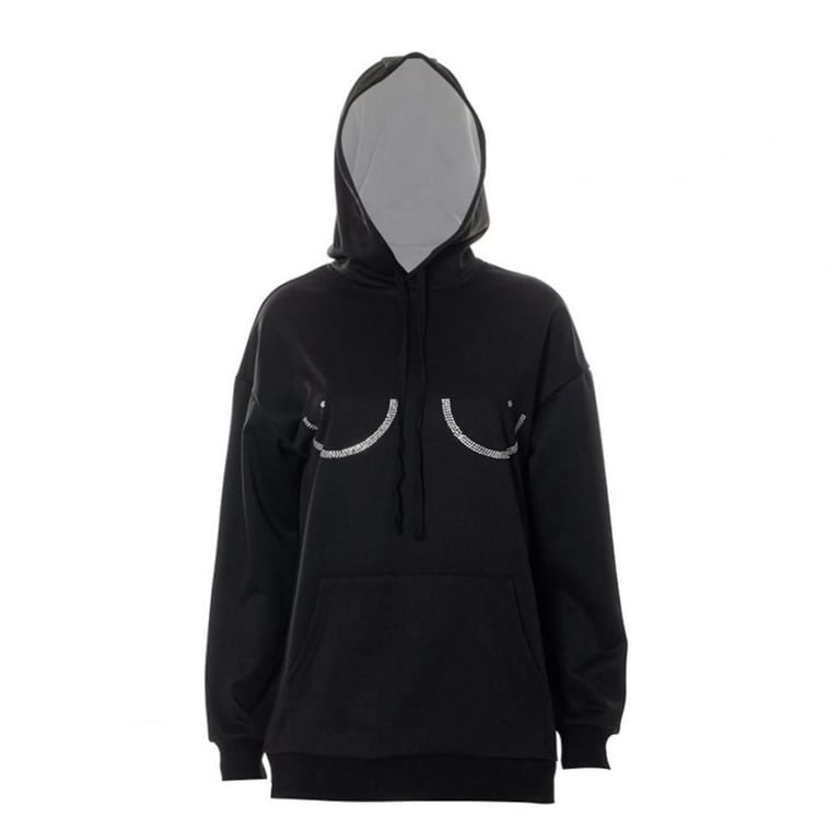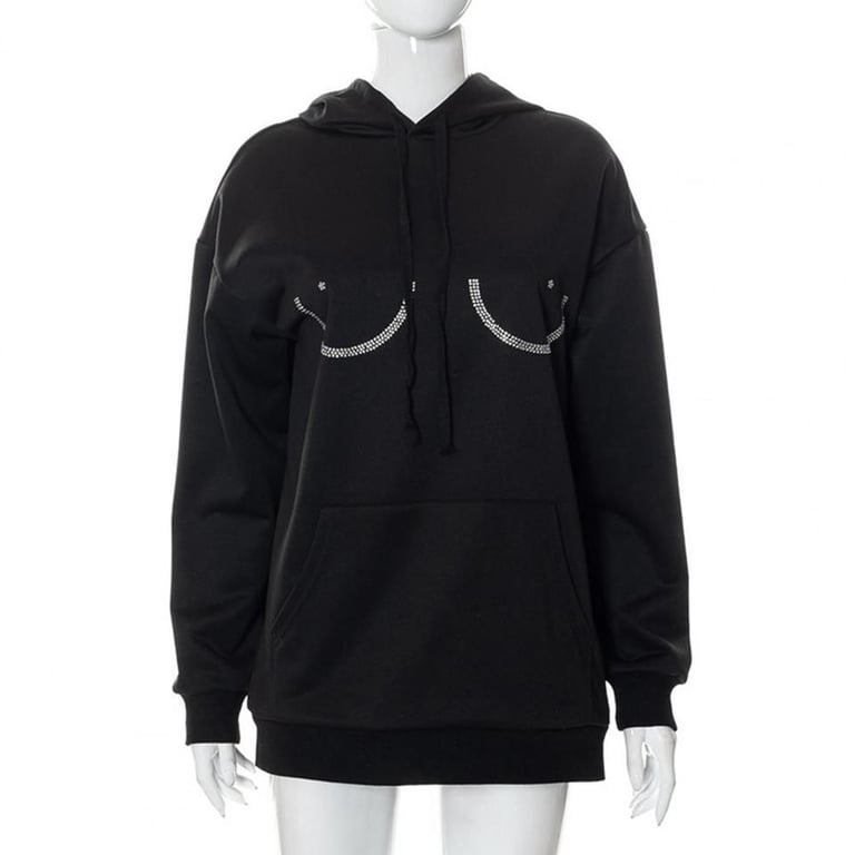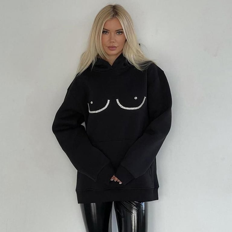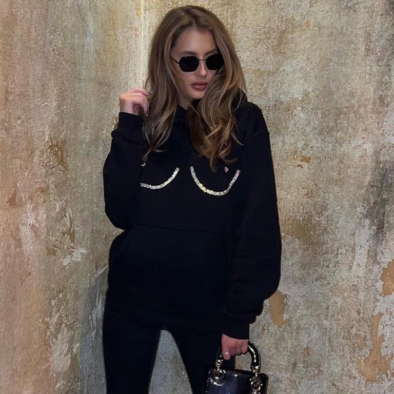 Women's oversized black hoodie with a funny rhinestone design.