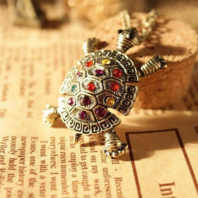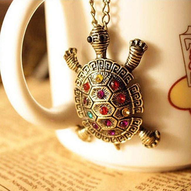 The ladies' necklace is adorned with a cute little turtle.