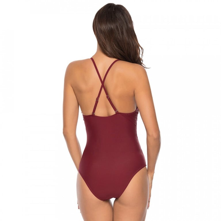 Women's one-piece swimsuit with narrow straps crossed at the back. V-neckline with ruffles. Available in multiple colour options.