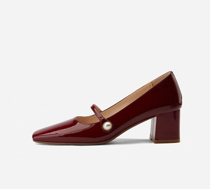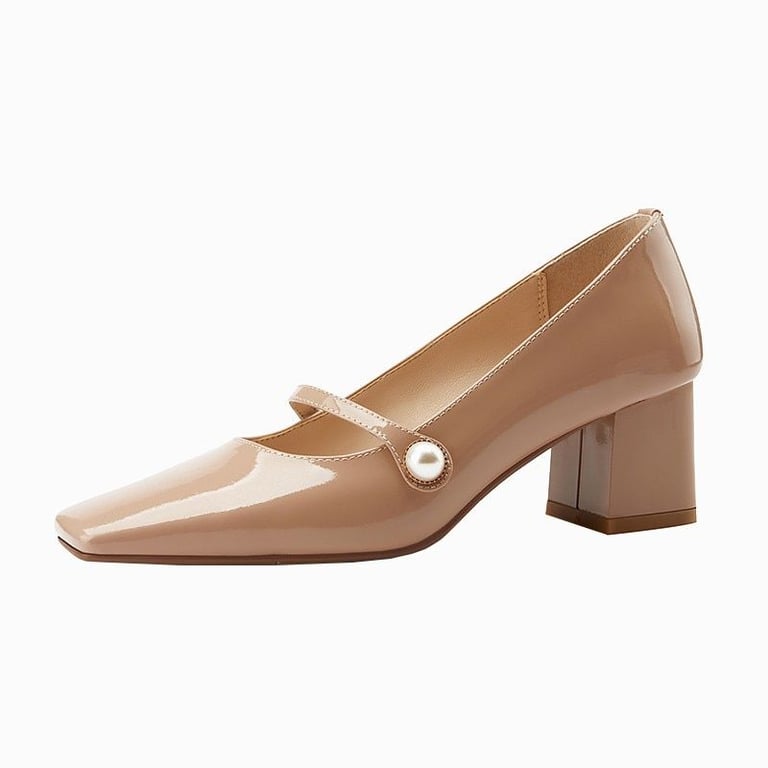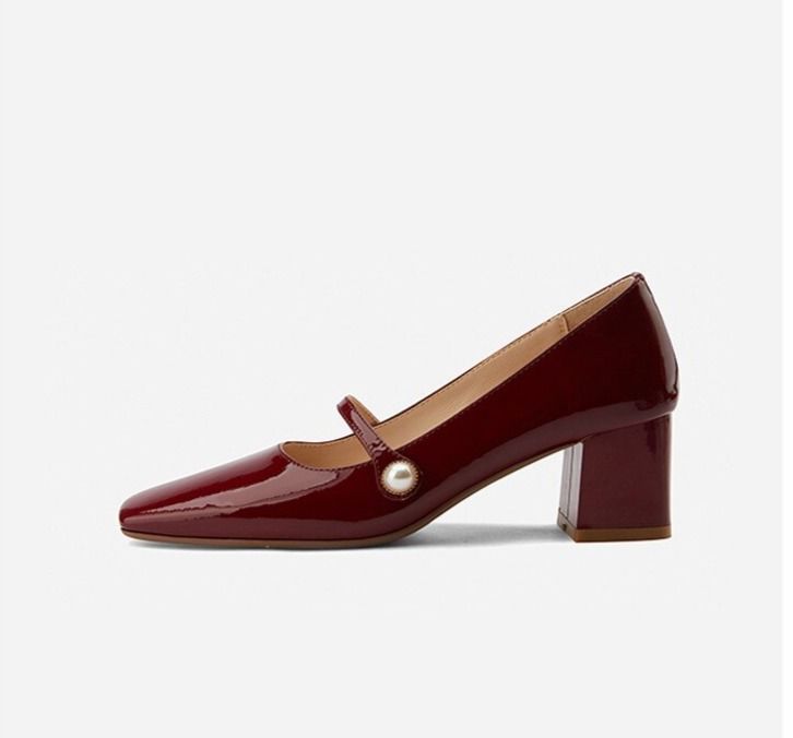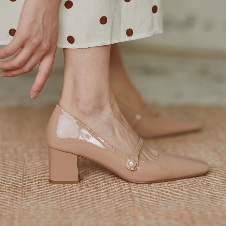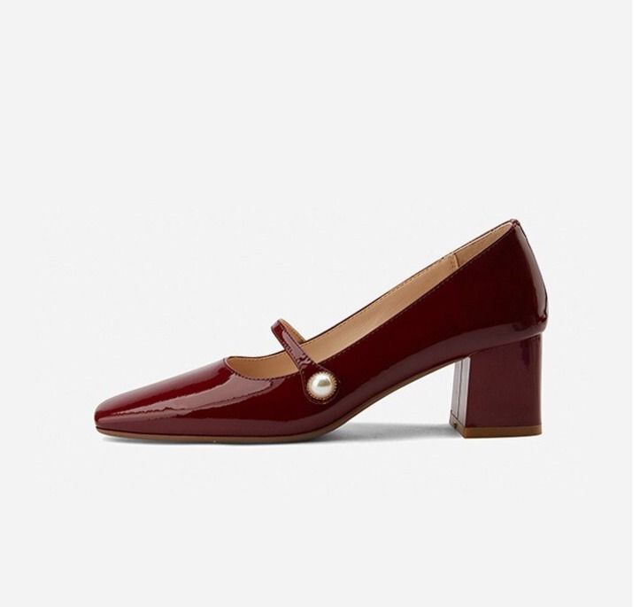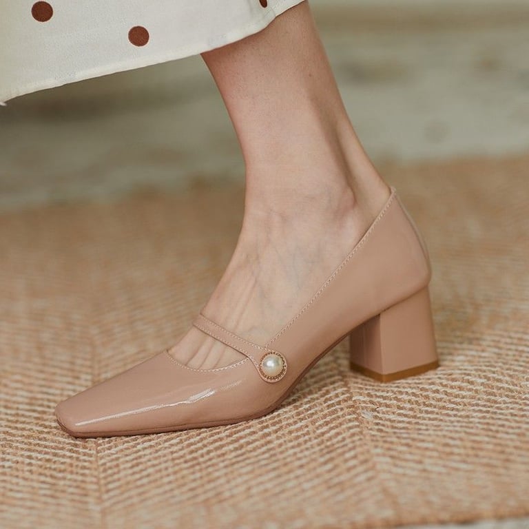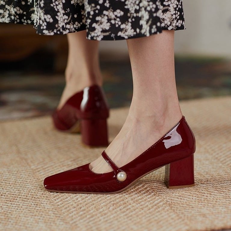Beautiful patent court shoes with a square toe and low heel.