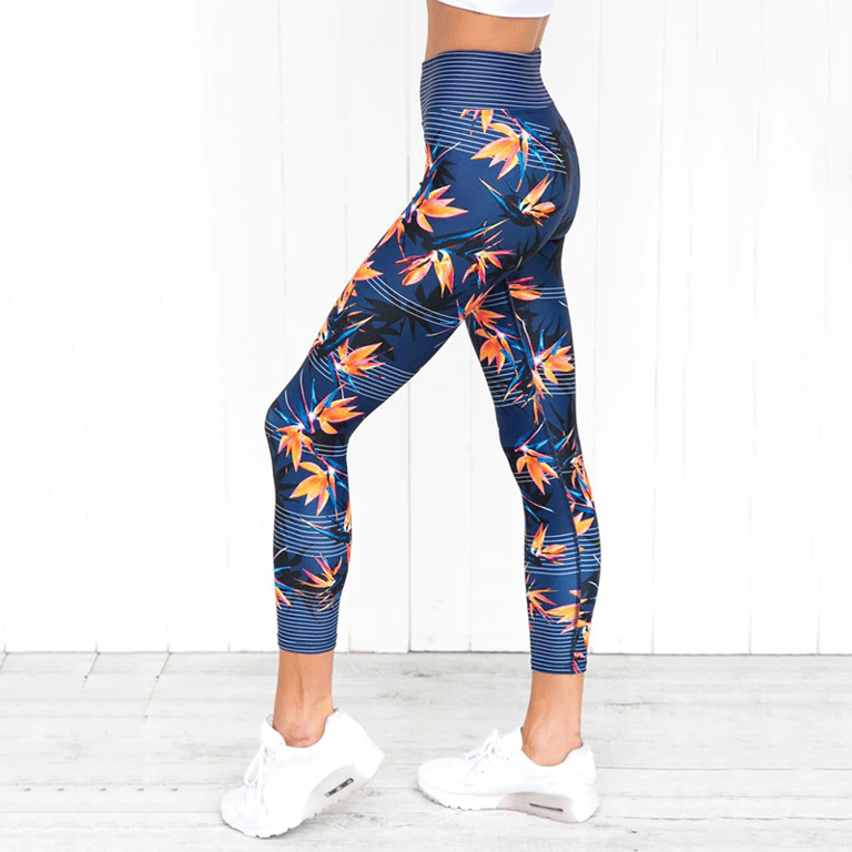 Unique women's leggings featuring a summer plant motif. The leggings are blue and have a high waist.