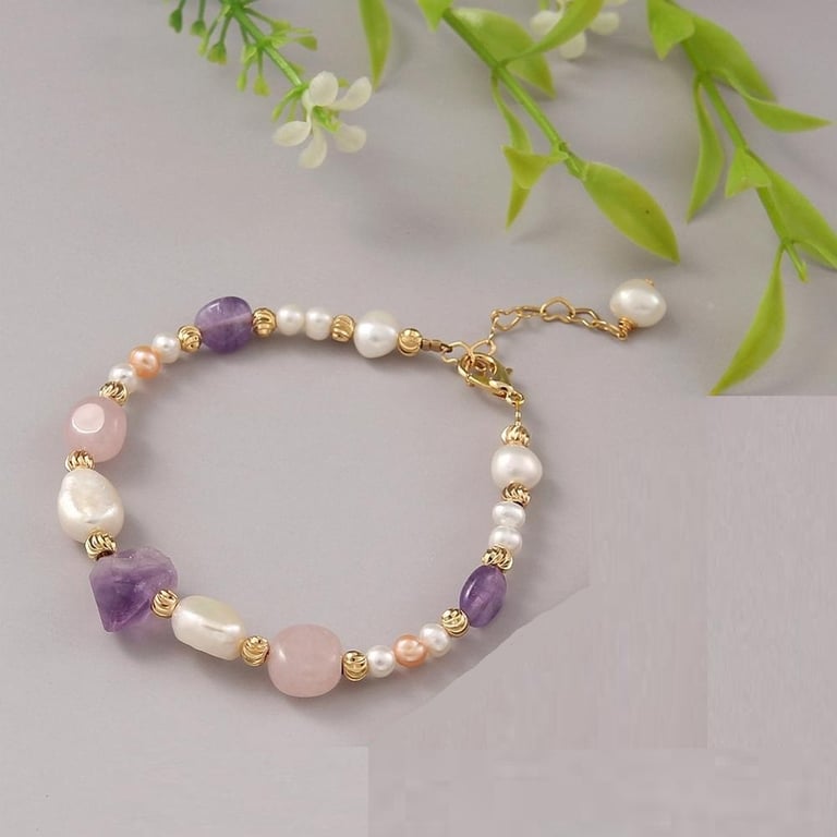 Material: costume jewellery metal, imitation pearl, imitation amethyst, imitation aventurine