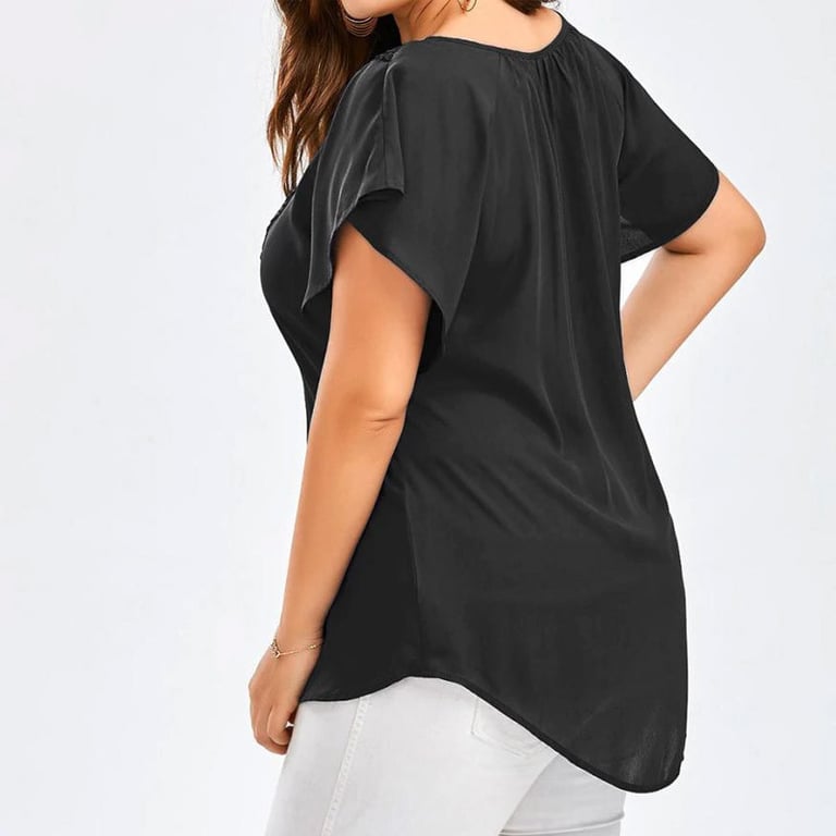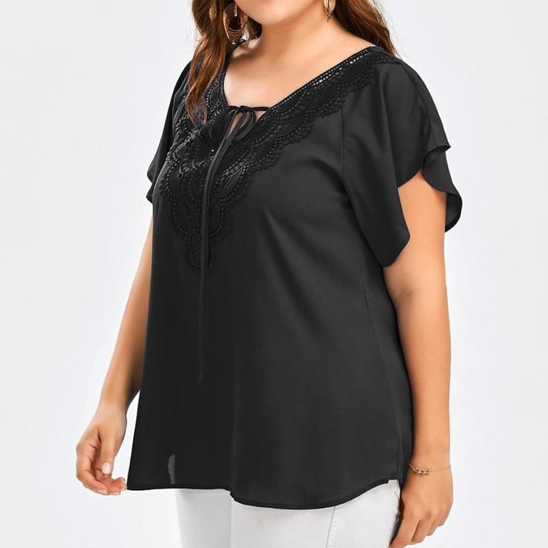 Women's loose-fitting plus size blouse with short airy sleeves. V-neckline with lace and lacing. Available in several colours.