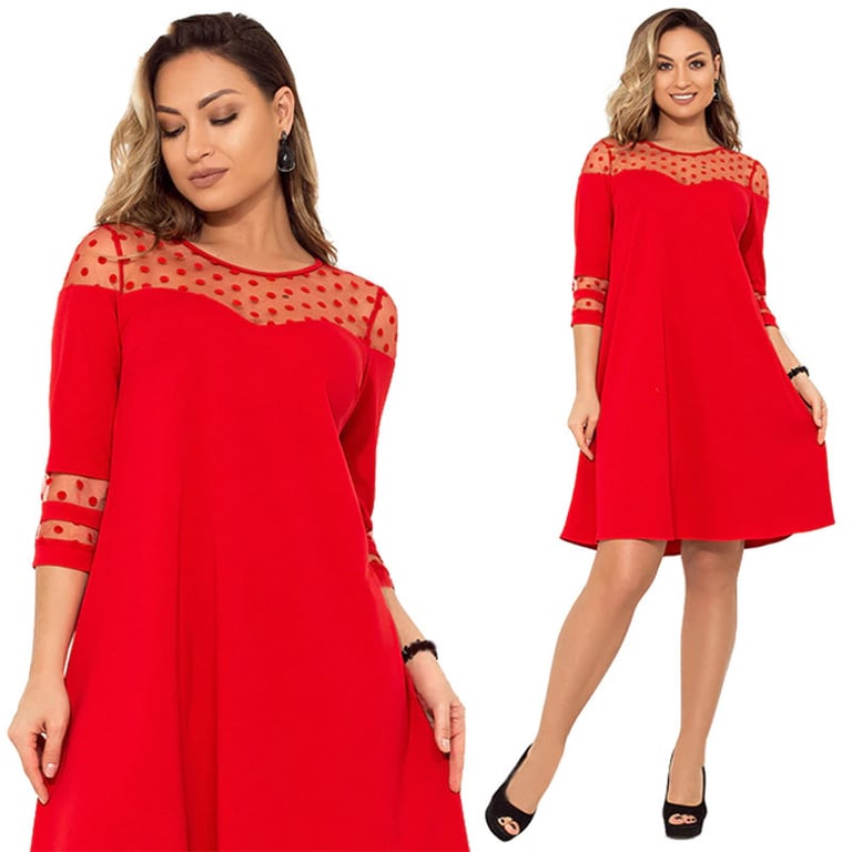 Women's dress decorated with polka dots. The dress has a /34 sleeve and a loose straight cut. Plus size available. Available in multiple colour options.