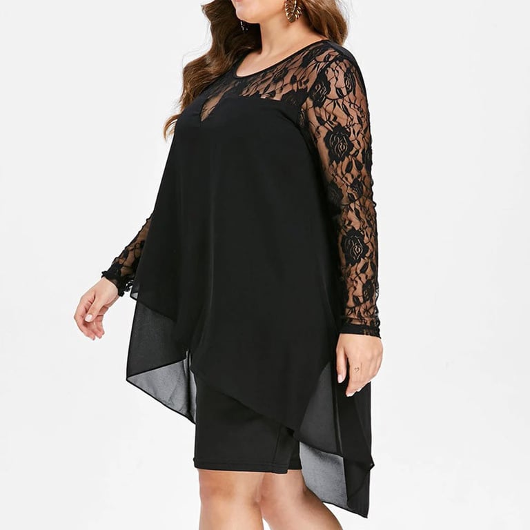 Women's dress with long sleeves adorned with lace. The dress has a loose fit and a round neckline. Plus size available. Available in multiple colour options.