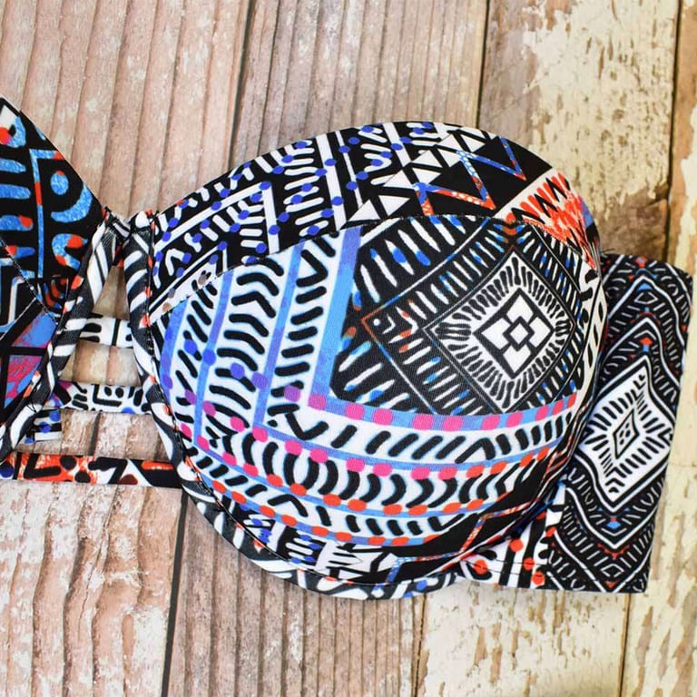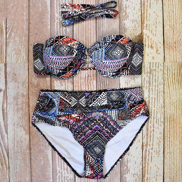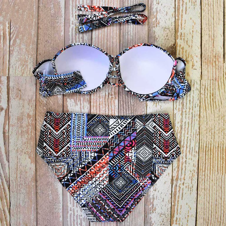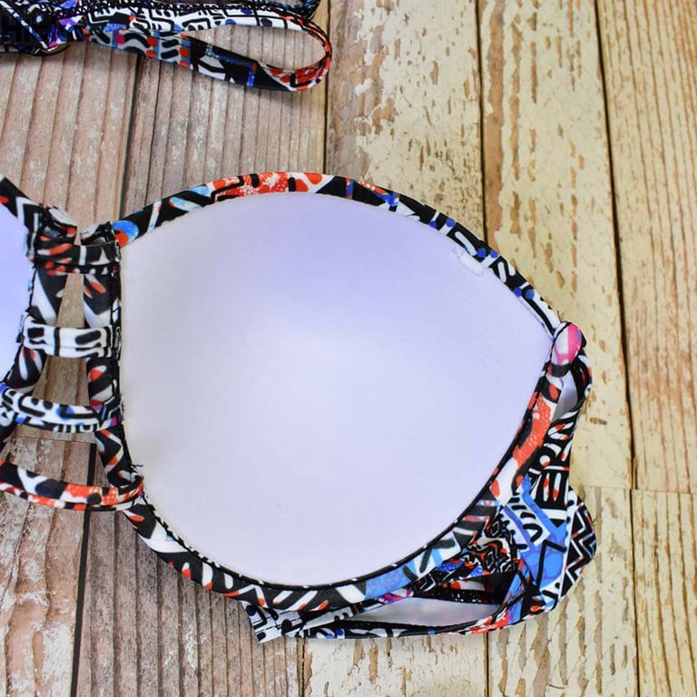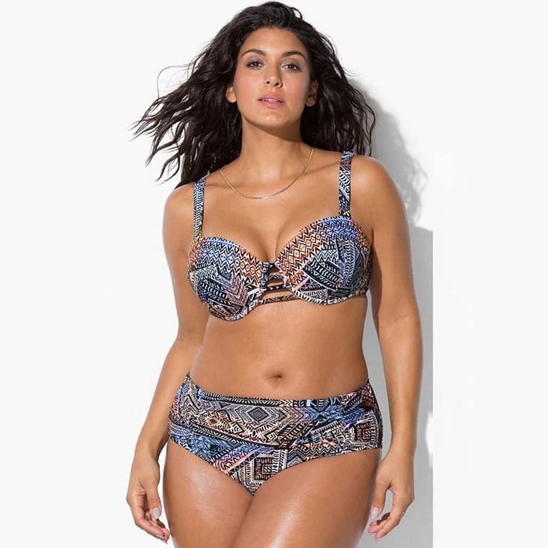 Women's two-piece swimsuit with wide straps and fastening with two clasps. The bottom has a medium-high waist and a slight cut. Multicoloured patterned design. Available in plus sizes.
