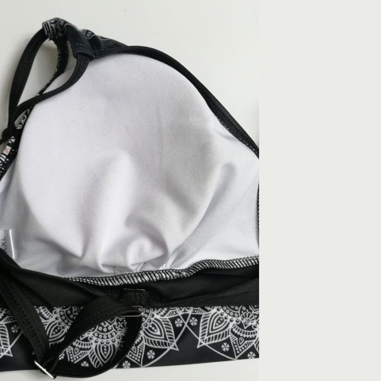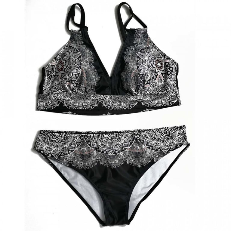 Women's two-piece swimsuit with double straps, V-neckline and wide band under the bust. The bottom is slightly cut. Available in plus size options.