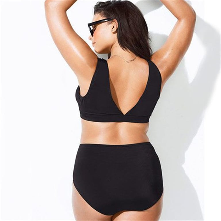 Women's bikini with wide straps and a V-neckline. The bikini bottom has a high waist with a subtle cutout. The swimsuit is in black with a print of colourful flowers. Available in plus size options.