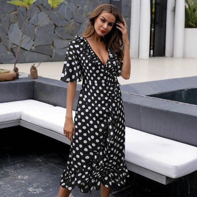 Summer women's dress with polka dots, short sleeves and a V-neck.