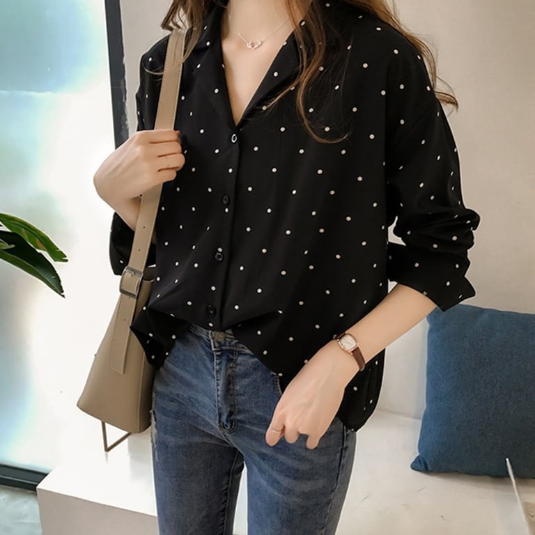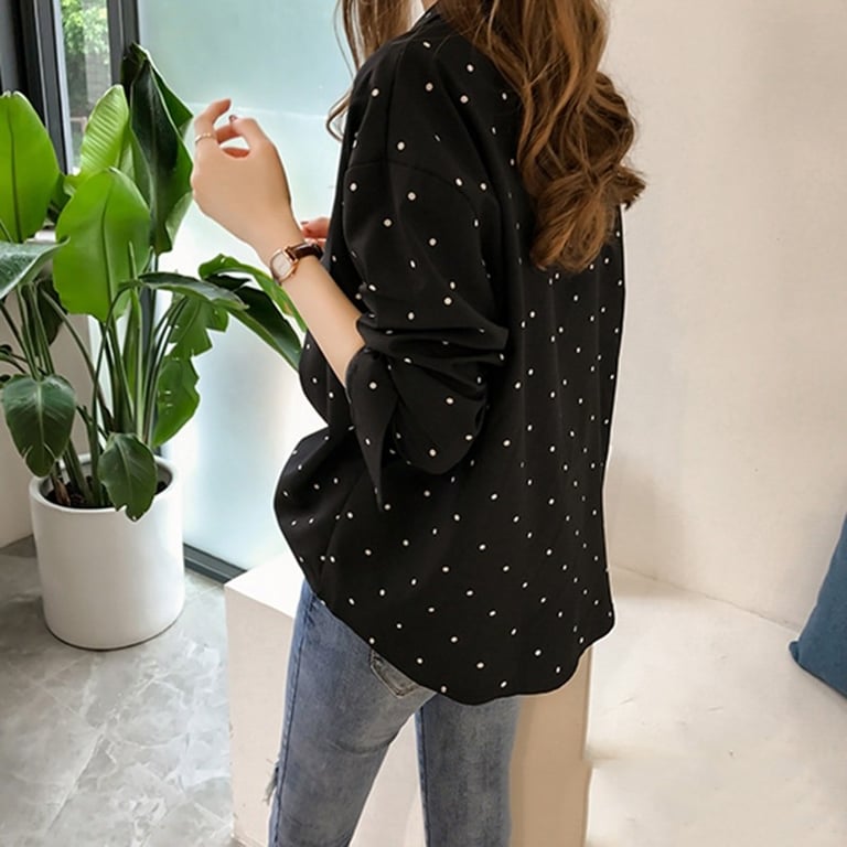 Loose-fitting shirt made from a pleasant material adorned with polka dots.