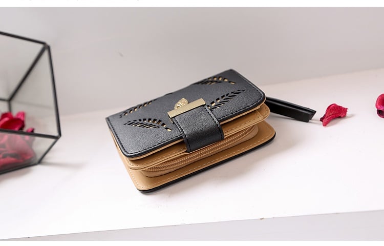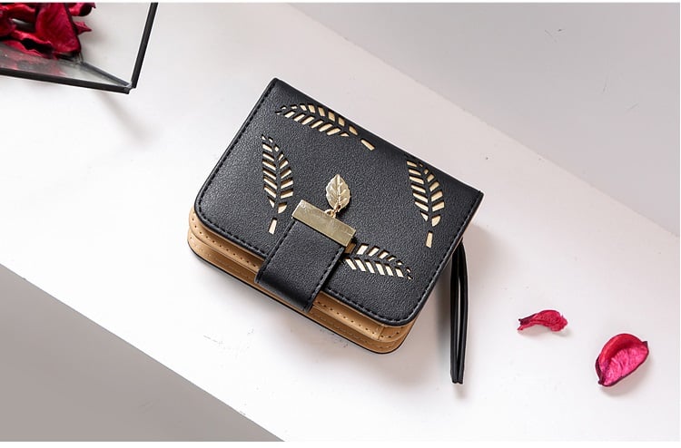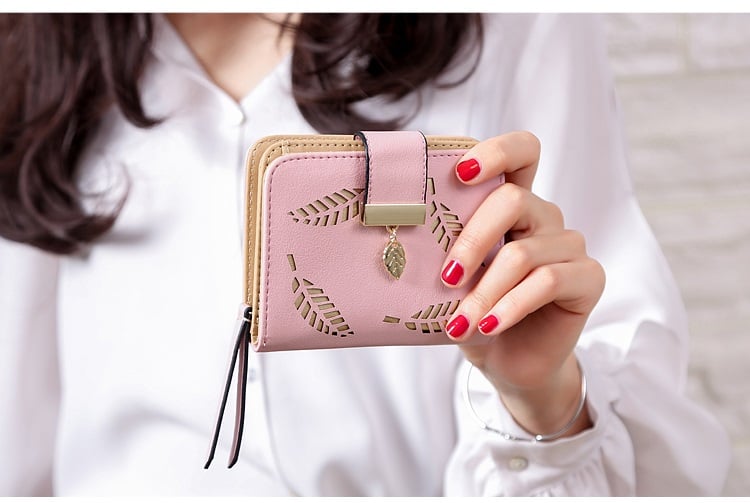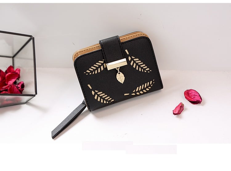 This beautiful wallet with a leaf print and leaf-shaped zipper is a practical women's accessory.