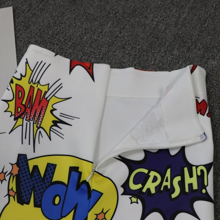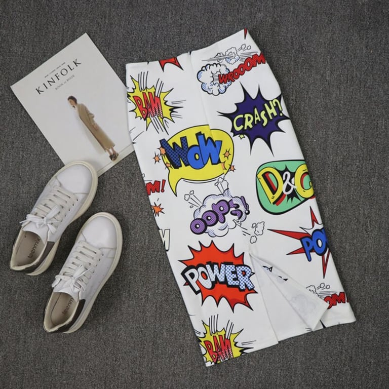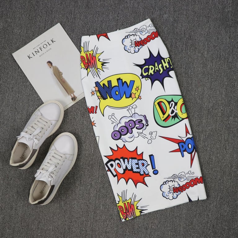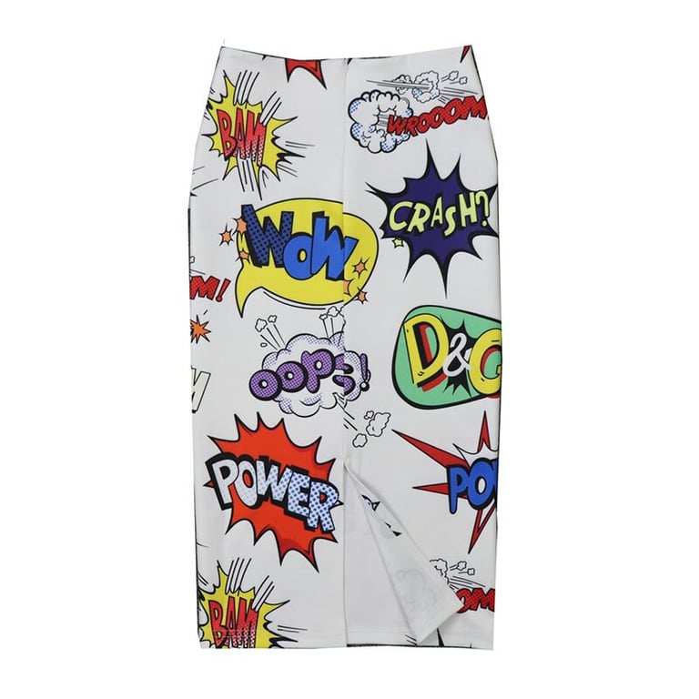 Women's pencil skirt with a high waist and a subtle slit at the back. Zip fastening. Colourful all-over print.