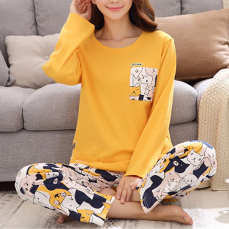 Women's pyjamas with a colourful print. Long-sleeved top. Trousers with long legs and an elastic waistband.