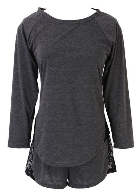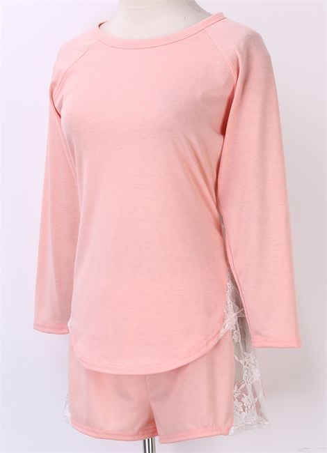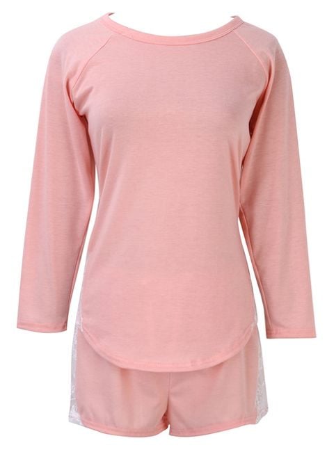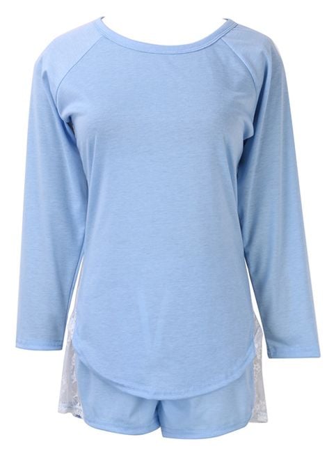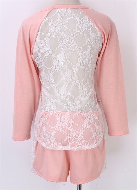 The pyjamas consist of shorts and a top with three-quarter sleeves. Both pieces feature lace details.