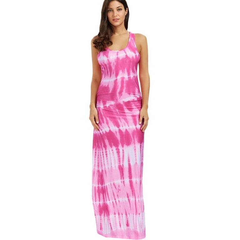 Women's long dress with a colourful rainbow print. The dress is sleeveless with wider straps and a round neckline. Available in multiple colour variants.