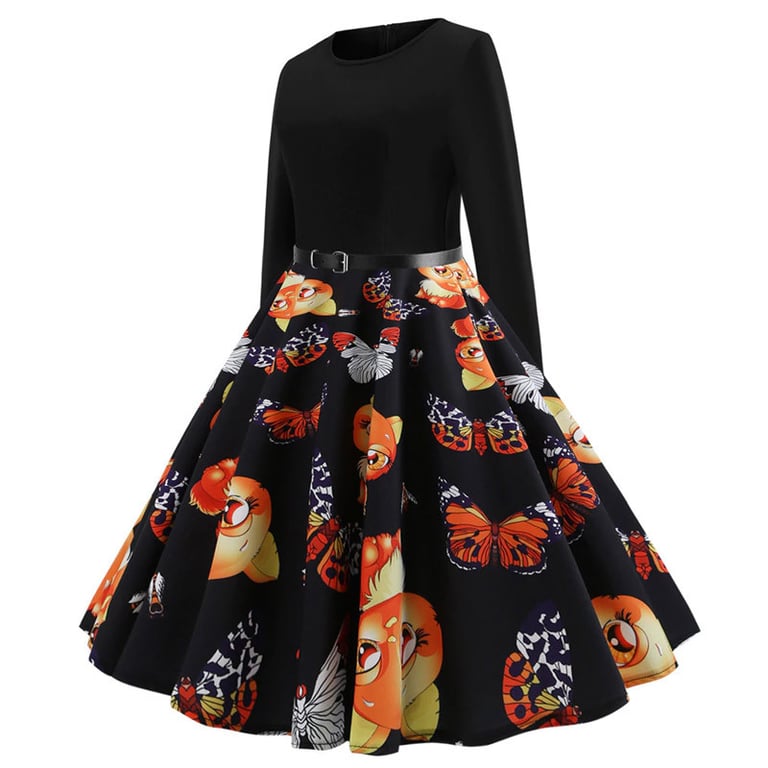Women's retro-style dress with a large voluminous skirt. The dress features long sleeves, a round neckline, and can be cinched at the waist with a belt. Available in several variations.