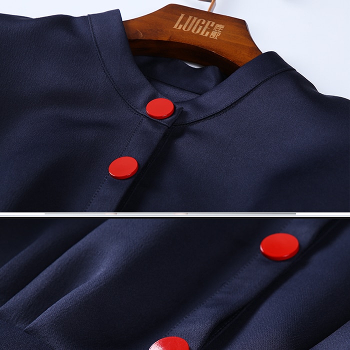 Adorned with contrasting buttons.