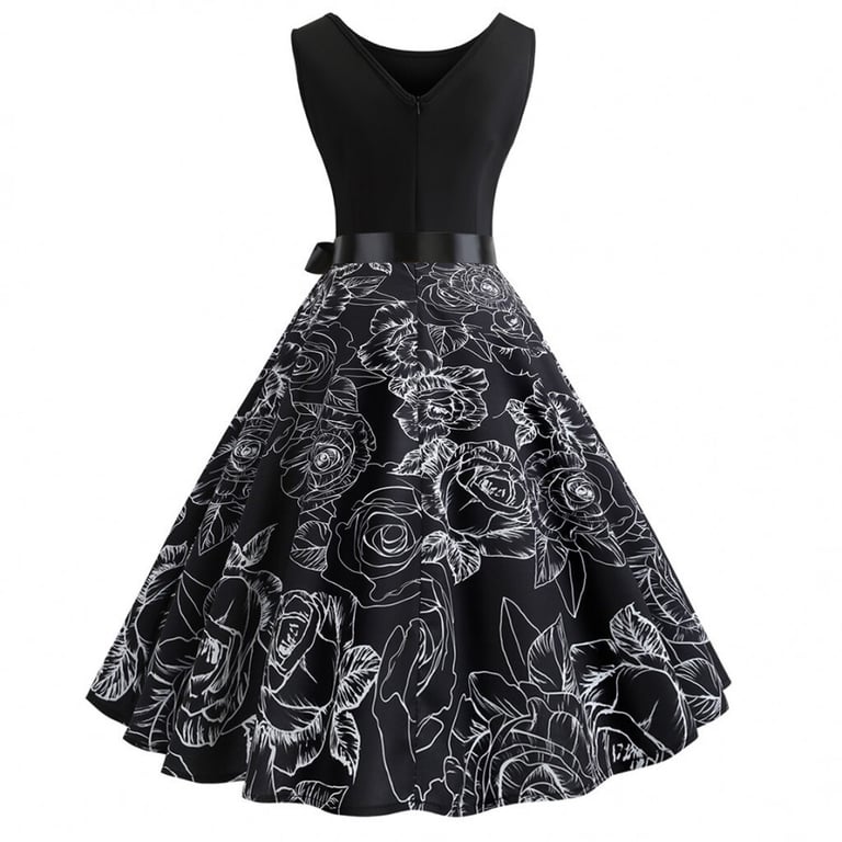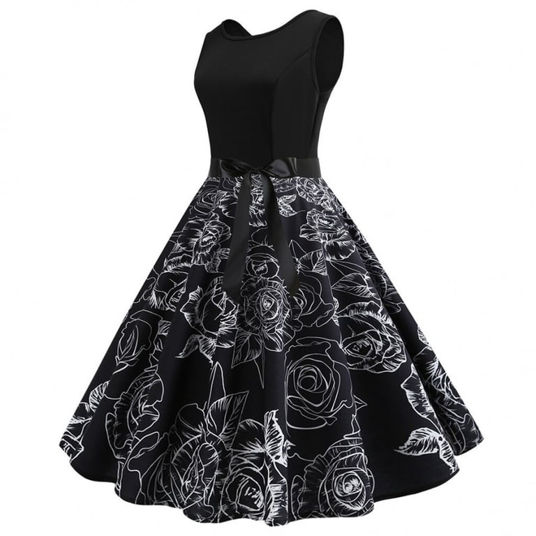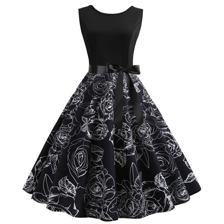Women's retro style dress with a wide A-line skirt and a delicate floral pattern. The dress is sleeveless with wide straps and a round neckline. It features a decorative ribbon with a bow at the waist. Zip fastening at the back of the dress.