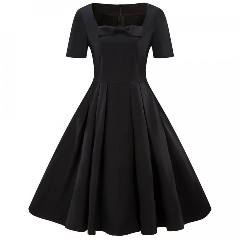 Women's retro style dress with a wide A-line skirt. The dress features short sleeves and a round neckline with a decorative bow. Fitted waist. Available in several colours.