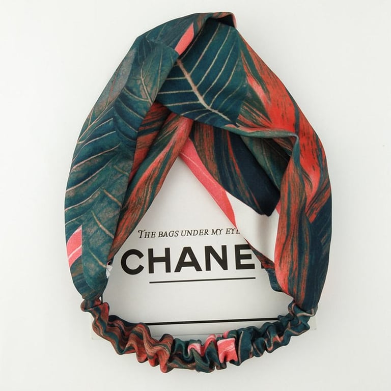 Women's hairband with a colourful tropical print and a decorative knot on the front. Available in multiple variations.
