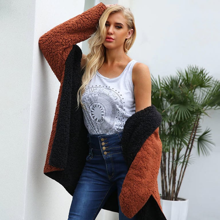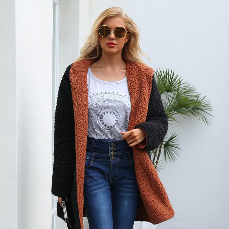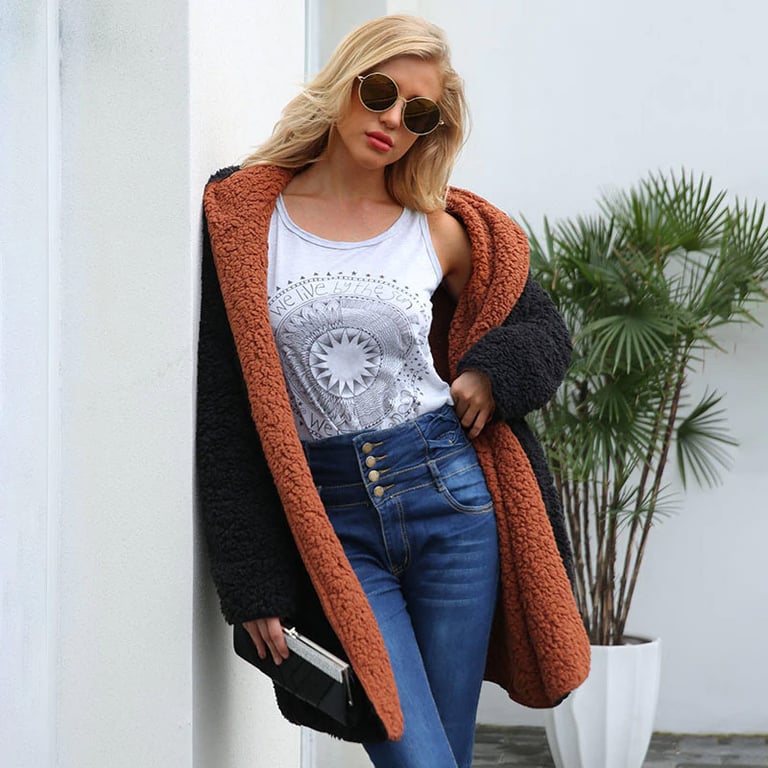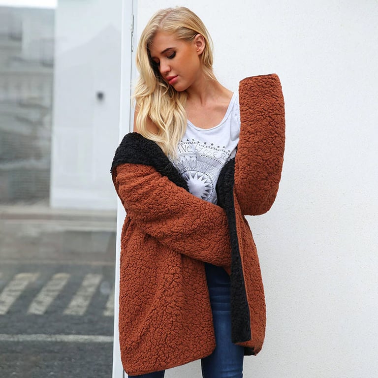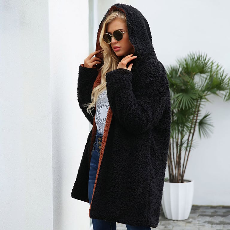 Women's warm fur coat in a loose fit, with a length below the hips and a hood. The coat can be worn on both sides. Available in several colour options.