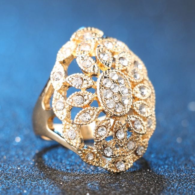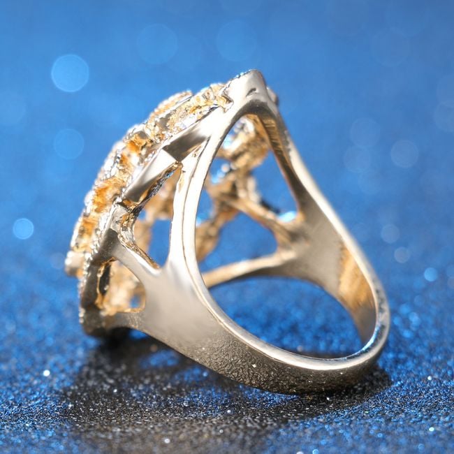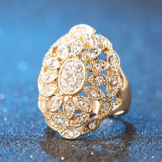 The ladies' ring is adorned with stones. It serves as a tasteful accessory.