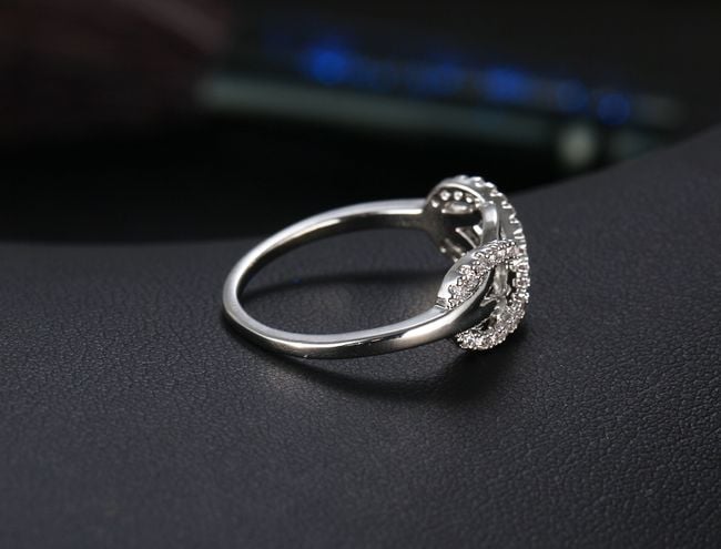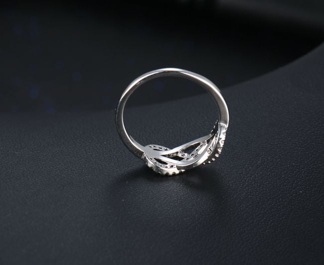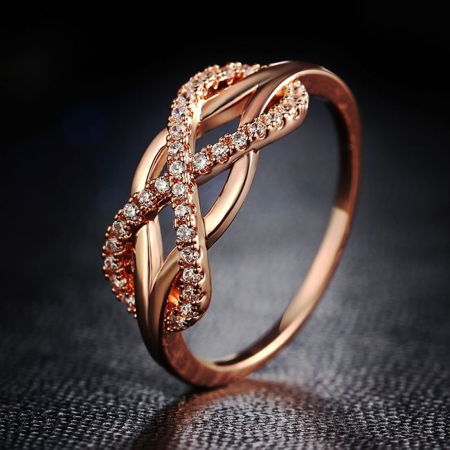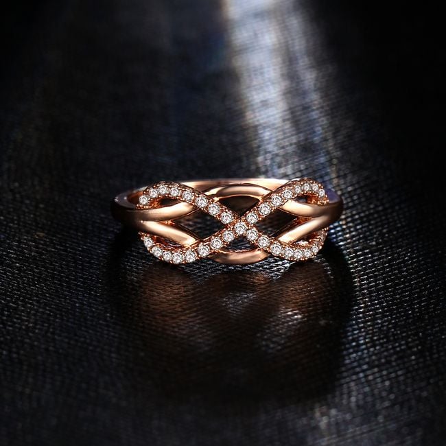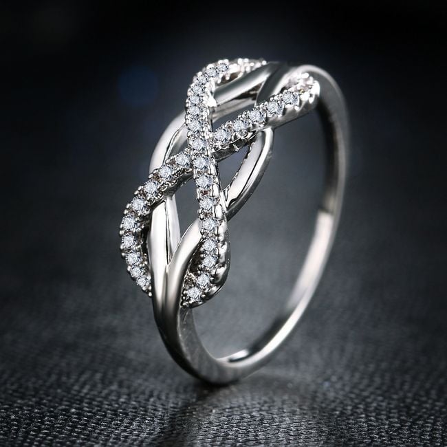 Delicate women's ring in gold or silver colour is adorned with an infinity symbol. It is set with tiny sparkling crystals.
