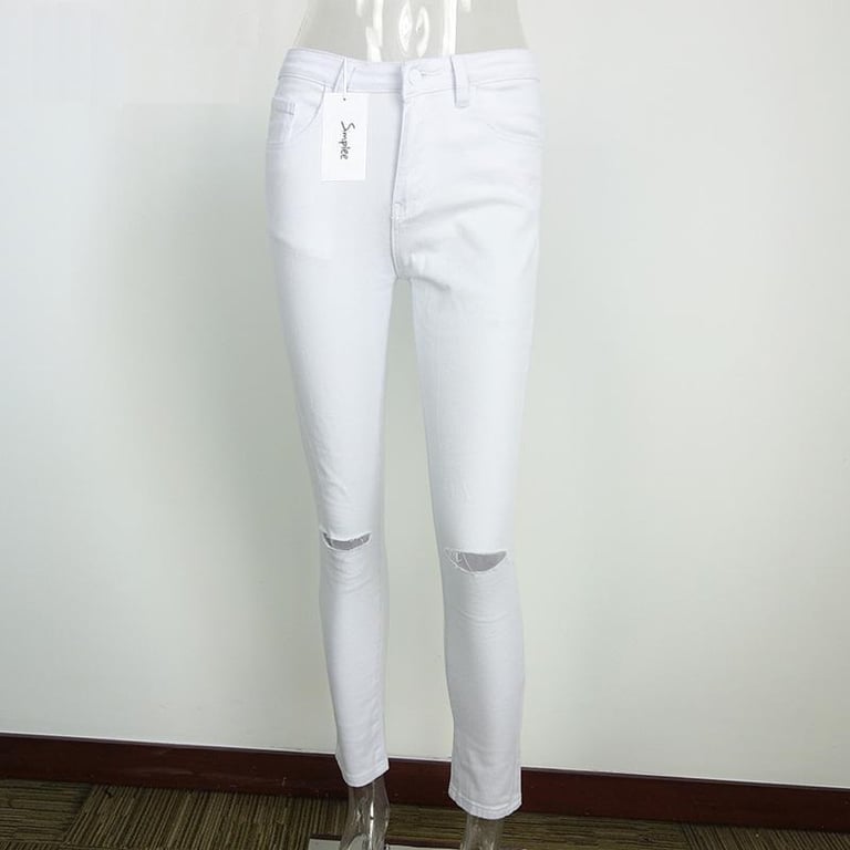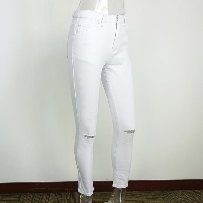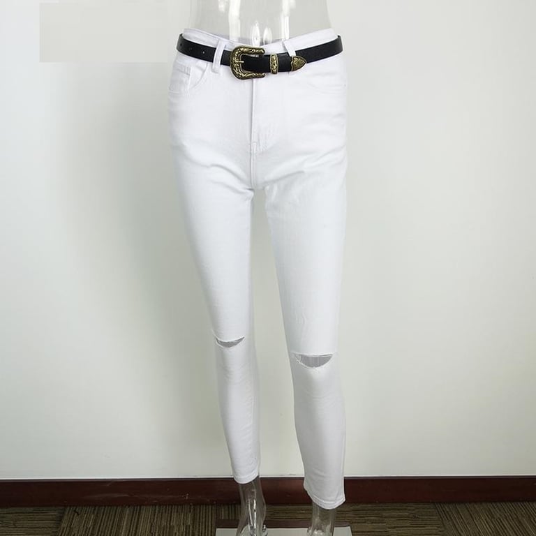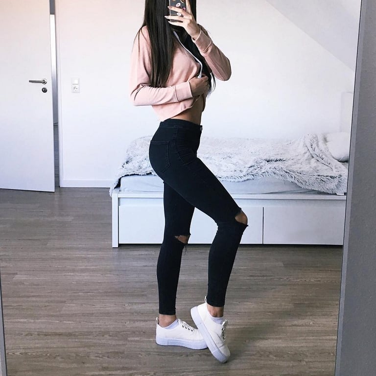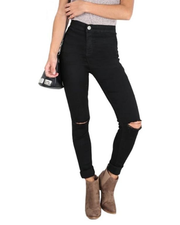Beautiful women's jeans, which are ripped at the knees, are very fashionable today.