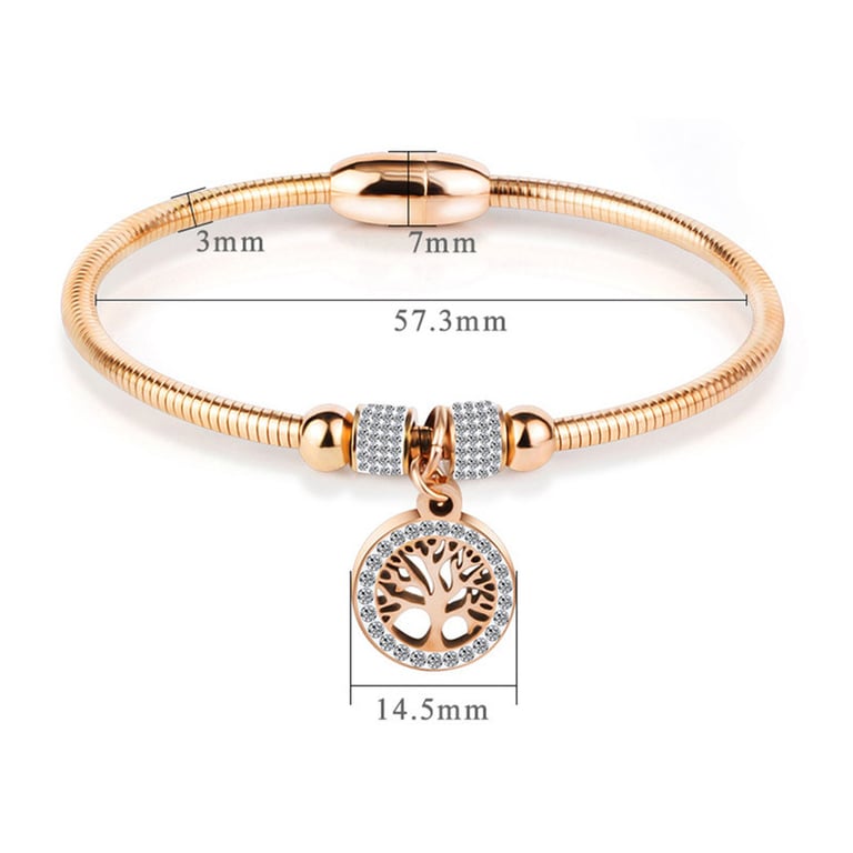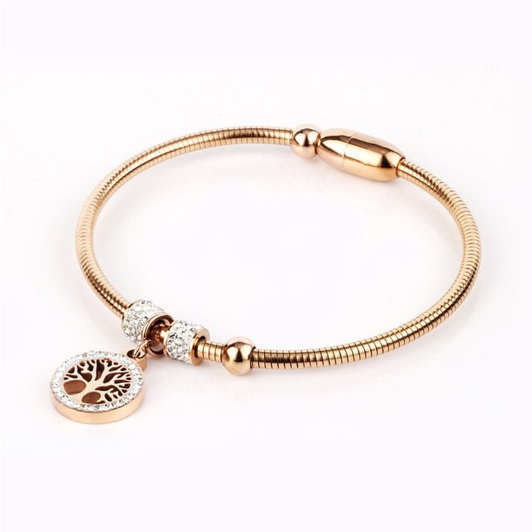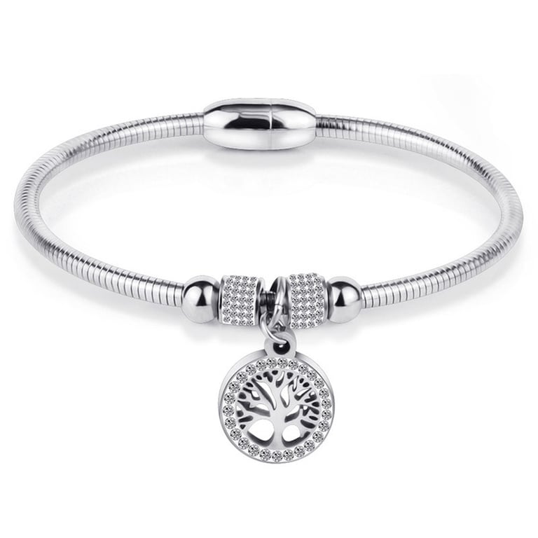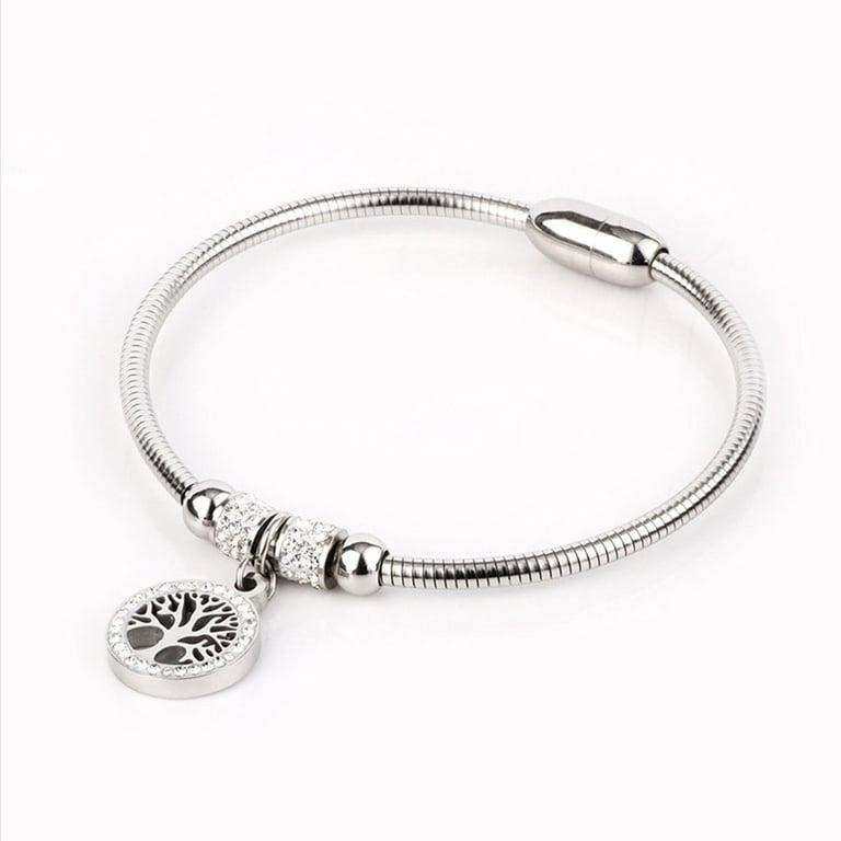 Women's strong round bracelet with beads. Pendant with a branching tree adorned with tiny white stones.