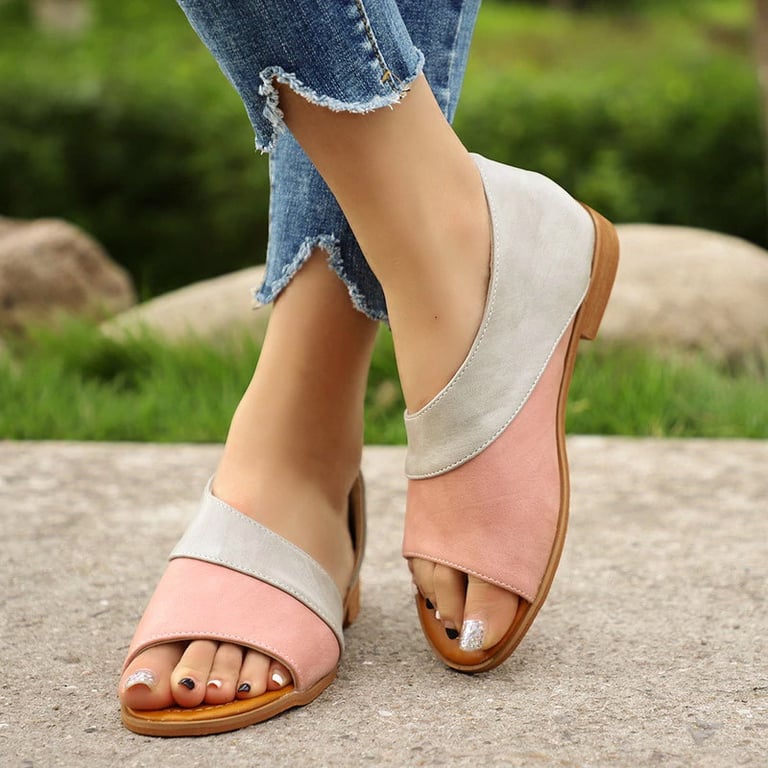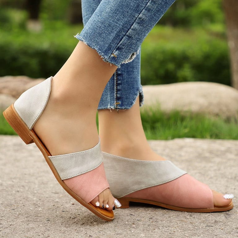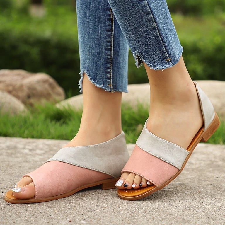 Women's sandals with an open toe and a sturdy heel. Flat sole. Leather look. Available in multiple colour options.