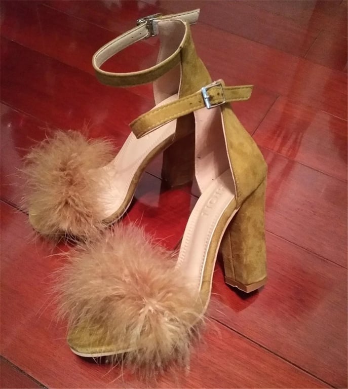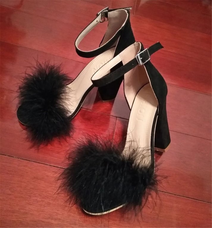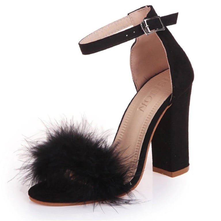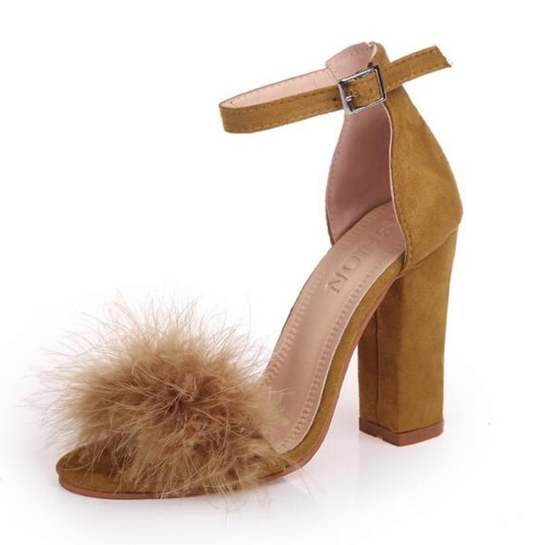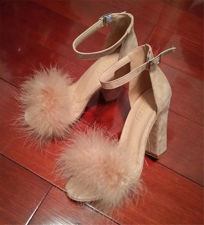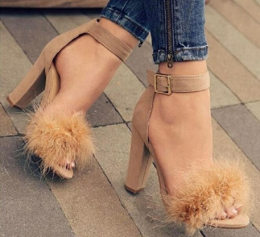 In these heeled sandals, you will look great. The sandals are adorned with faux fur.
